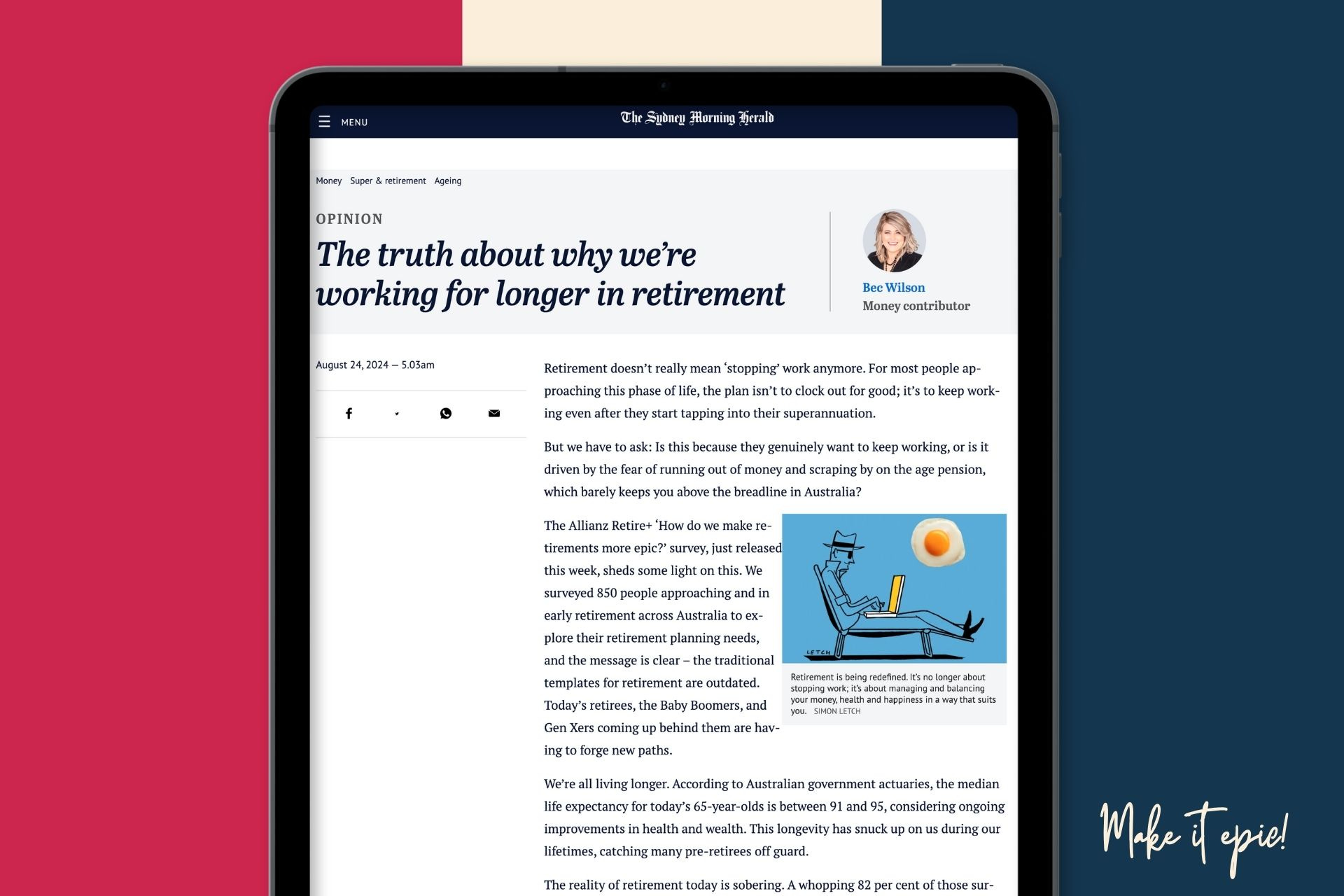 I’ve worked with the wonderful people at Allianz Retire+ to produce a detailed paper for the financial services industry. The paper talks about what today’s retirees need and want, and is designed to give financial advisers and super funds some insight into how they can make your retirements more epic! The report is seriously called “How do we make retirements more epic?”