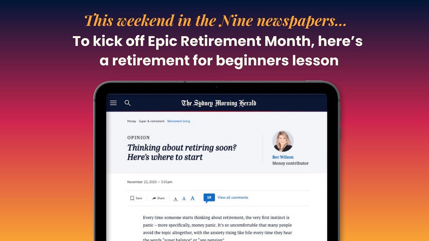 I’ve just dropped a terrific column in The Age and The Sydney Morning Herald, tied to Epic Retirement Month too - ‘Thinking about retiring soon? Here’s where to start’
