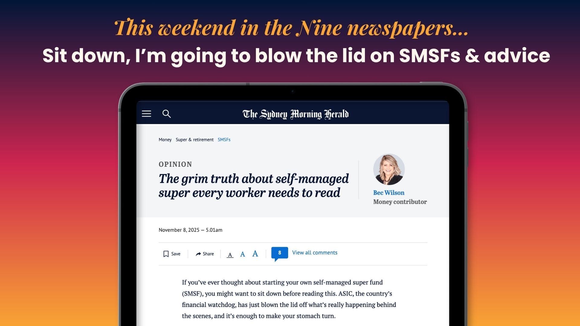 And, in today's newspapers nationwide "The grim truth about self-managed super every worker needs to read"