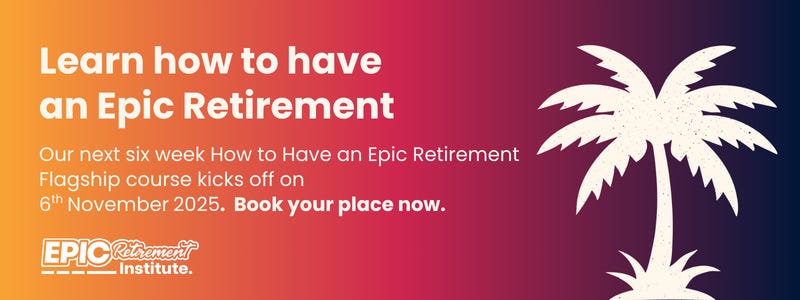 On that note — our How to Have an Epic Retirement Flagship Course is still available at the 25% early bird rate. We’ve added a few extra places at the lower price, but not for much longer. So if you’ve been thinking about joining, now’s the time! You can register your place here and download the brochure to learn more about what’s inside.