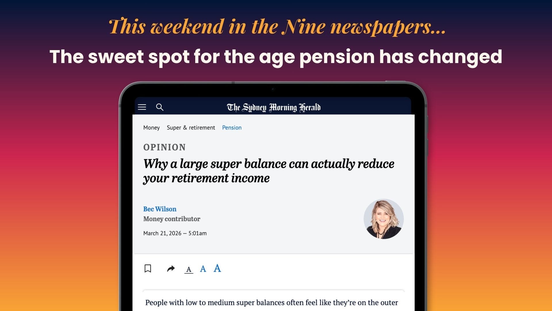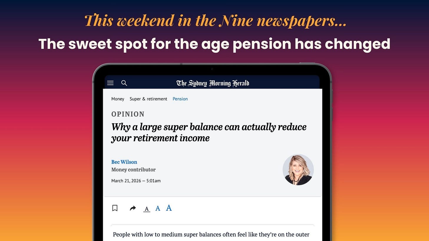 And in this weekend's newspapers: The sweet spot has changed: Why having less super can sometimes mean you get more retirement income